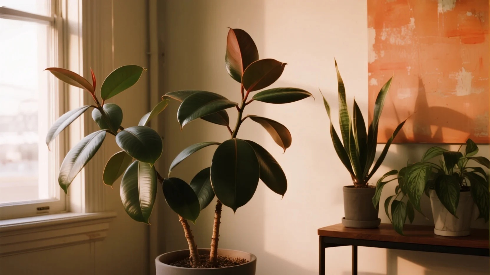 The Rubber Plant (Ficus elastica) is a classic houseplant known for its large, glossy leaves and architectural form. With its deep green or burgundy foliage, it makes a striking statement in any inter...