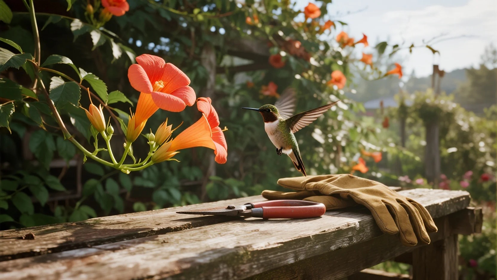 The Trumpet Creeper (also called Trumpet Vine) is a fast-growing flowering vine known for its vibrant orange-red trumpet-shaped flowers that attract hummingbirds. While it’s a vigorous gr...